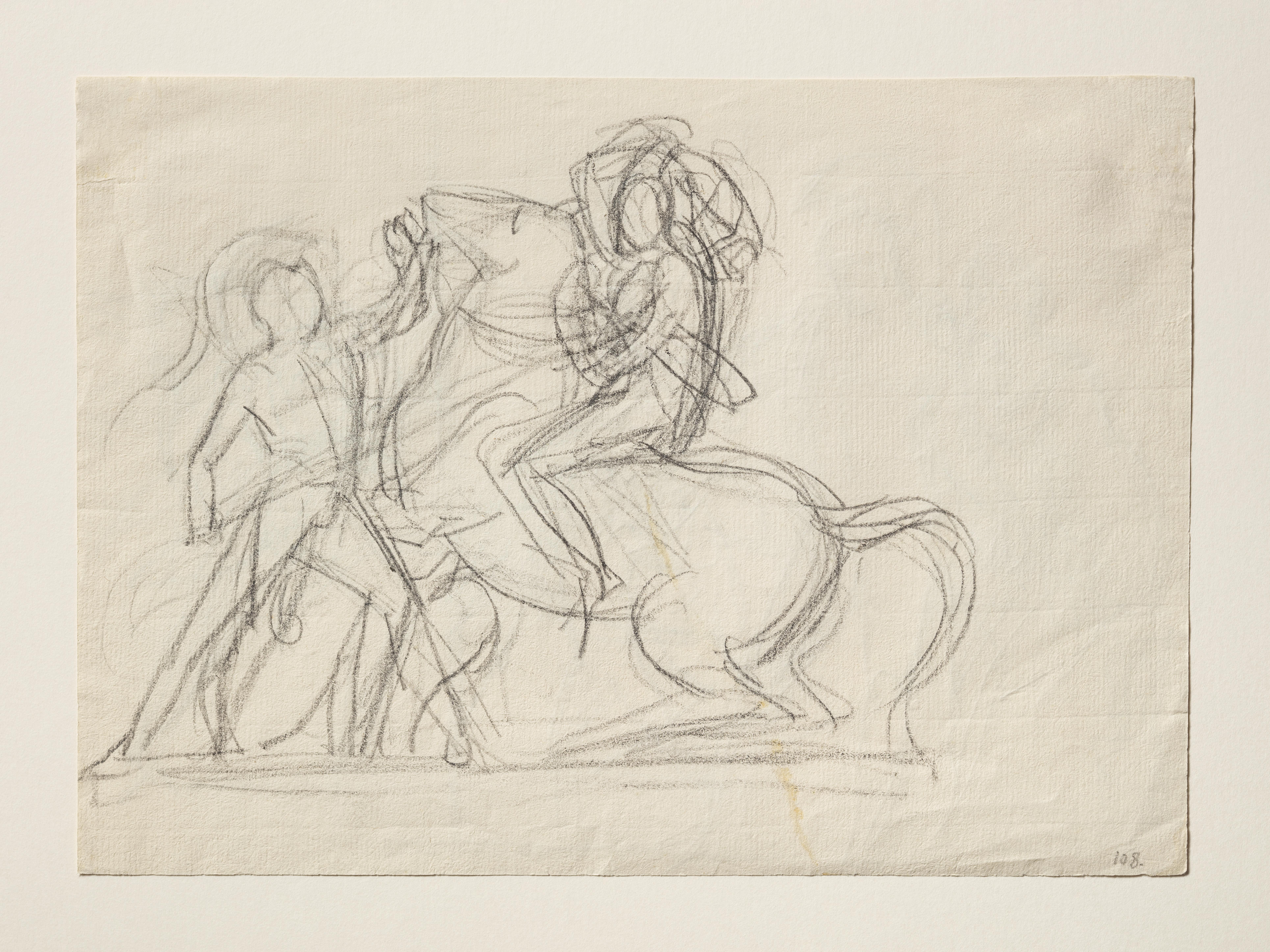 Dramatikken er i højsædet i dette motiv, og Thorvaldsen har tilsvarende arbejdet med hurtige, søgende streger. Allerede i 1801 var han med afsæt i Museo Capitolinos samlinger optaget af amazonemotivet, og han både tegnede og modellerede gruppen forestillende Achilles og den døende Pentheselia. 1805-10 udførte han en serie hurtige skitser, hvor de krigstrænede amazoner ses i heftig kamp på trojanernes side under grækernes belejring af Troja.