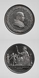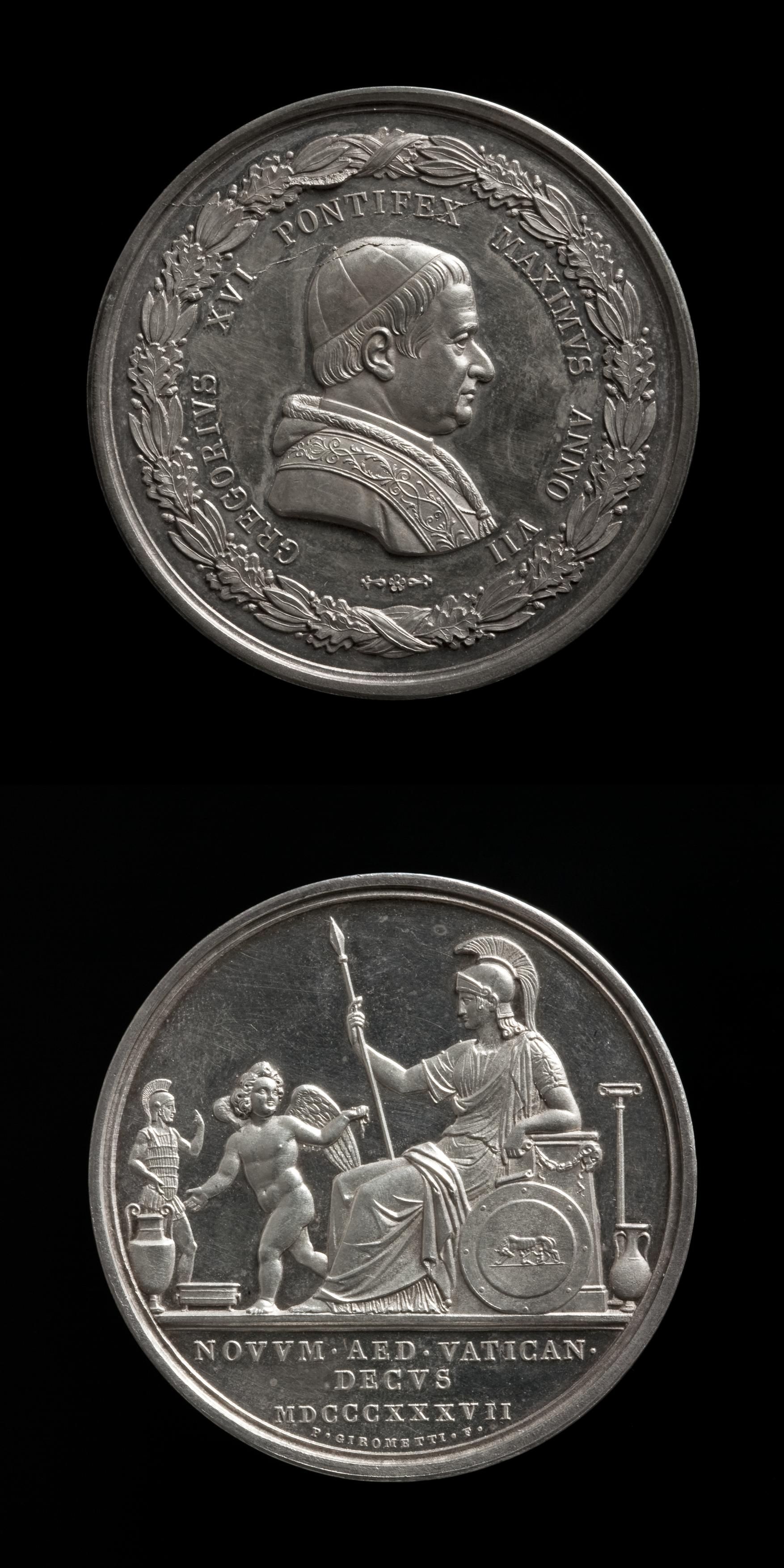 Medaljens forside: Pave Gregor 16. Medaljens bagside: En vinget genius viser Roma de etruskiske antikker